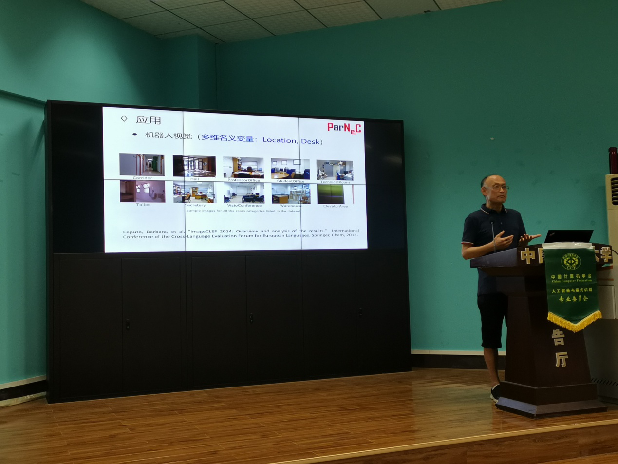(通讯员:蒋良孝)“CCF-AI走进高校系列报告会”第二十三期于2019年6月16日在买球赛十大平台成功举办。该活动由十大买球官方网站承办,十大买球官方网站蒋良孝教授具体负责组织工作。此次报告会,南京航空航天大学陈松灿教授、东南大学耿新教授、西南大学余国先教授应邀作学术报告。陈松灿教授的报告题目为:多维输出分类学习;耿新教授的报告题目为:面向标记分布学习的标记增强;余国先教授的报告题目为:多聚类发现研究。来自买球赛十大平台、武汉大学、华中科技大学、中南财政政法大学、武汉工程大学、江汉大学、湖北第二师范学院、武汉艾维视智能技术有限公司等单位的近130名师生及企业技术人员共同参加了本次系列活动。