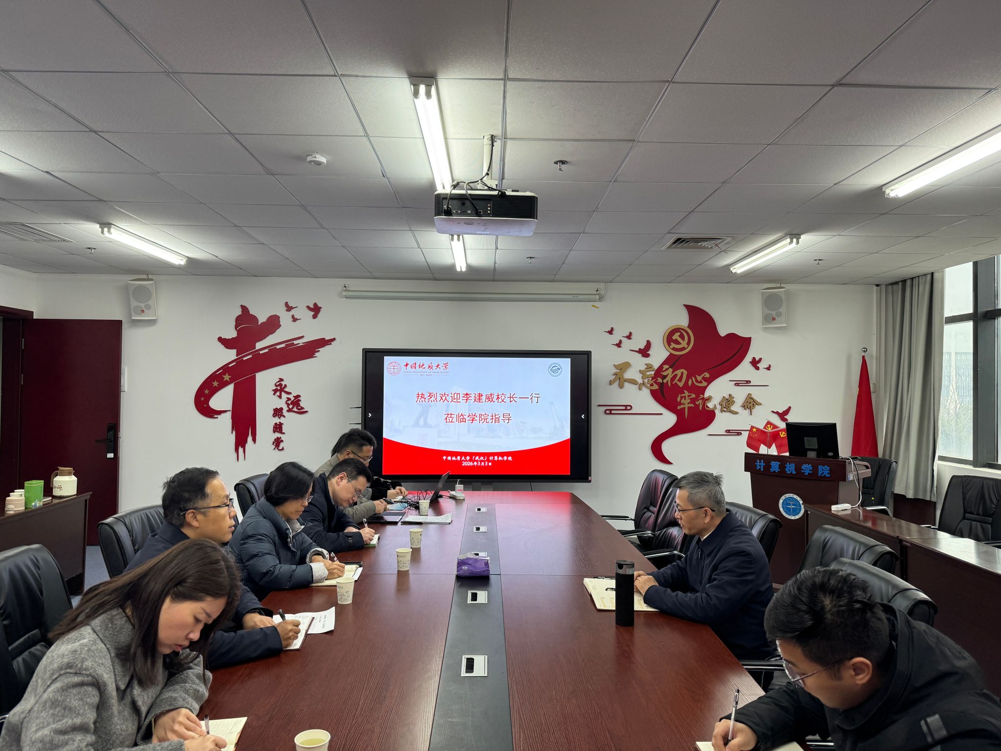 李建威校长认真听取了汇报,并对相关工作细节进行了深入细致的了解。他充分肯定了学院在“十四五”期间取得的成绩,并就学院如何在“十五五”期间继续发挥学科优势、支撑学校“双一流”建设与高质量发展提出指导意见。他强调:要坚守立德树人根本任务,高度重视学生思政教育与心理健康,通过优化培养方案、更新教学内容、引入前沿技术,打造高水平课程体系,培养“又红又专”的时代新人。要实施人才强院战略,通过“以才引才”及“传帮带”机制,让青年教师有归属感和成就感;落实全员育人责任制,鼓励导师深度参与思政工作,形成“三全育人”合力。要聚焦学科建设重点,全力攻坚软件工程博士点申报,拓展学科攻关空间。要深化产教融合,坚持“入主流、强特色”,紧跟人工智能前沿,深度融合地质、资源等优势学科,拓展与头部企业合作,争取重大项目,提升成果转化效能。要筑牢安全防线,严守意识形态阵地,防范网络风险;紧盯实验室用电、数据及设备安全,杜绝火灾隐患;做实毕业生就业指导与心理疏导工作,确保学院大局和谐稳定。
