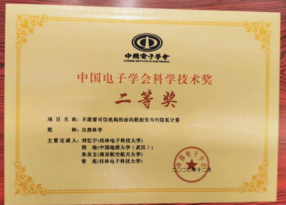 (通讯员:章丽平)2021年4月17-18日,中国电子学会2020年度科学技术奖励大会在重庆举行。十大买球官方网站信息安全系程池老师与桂林电子科技大学、南京航空航天大学的学者共同完成的“不需要可信机构的面向数据发布的隐私计算”荣获2020年度中国电子学会科学技术奖自然科学二等奖。郝跃院士、刘明院士等23位院士出席大会并颁奖。