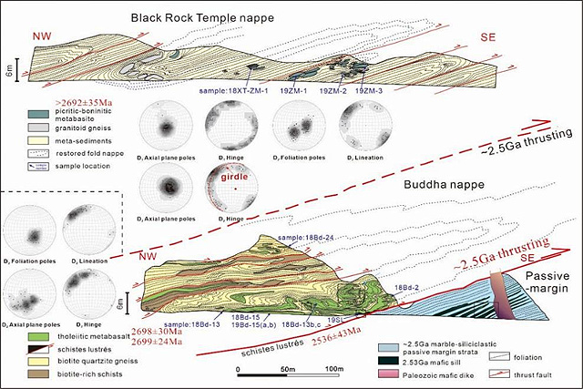 地球早期地质记录中因缺乏大规模板块汇聚、俯冲和碰撞的明确证据,导致前寒武纪是否存在类似现代的板块构造充满争议,是国际固体地球科学热点前沿和难题之一。蛇绿岩、构造(蛇绿)混杂岩、双变质带、俯冲起始岩浆和相关水平推覆构造等是水平板块构造的产物和直接判别标志。蒂姆·柯斯基教授带领的研究小组,在过去20年里,在华北克拉通中部造山带东缘识别出一系列25亿年蛇绿岩、构造(蛇绿)混杂岩、双变质带,从而确定一条近南北纵向延伸1600余公里的弧陆碰撞增生型造山带。研究在其基础上,在这一构造带内新近发现和报道至少在25亿年前就形成的阿尔卑斯式近水平褶皱/逆冲推覆体,论证了在27亿至25亿年前这段时间,板块横向构造位移使至少3560公里宽的洋壳发生俯冲消减,直到约25亿年前发生弧陆碰撞实现板块边界的拼合,为地球早期(太古宙)存在水平板块构造提供直接证据。