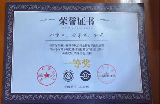 7月15至16日,由山东气象学会、浪潮数字(山东)建设运营有限公司、山东信息协会联合主办的第一届齐鲁风云气象智能算法挑战赛决赛及颁奖仪式在济南完美收官。历经初赛、复赛、决赛的层层选拔和激烈角逐,十大买球官网教师刘佳指导的研究生邓重九、金永军、熊奇组成的团队获得“0-6小时降水临近外推预报算法”赛道一等奖。