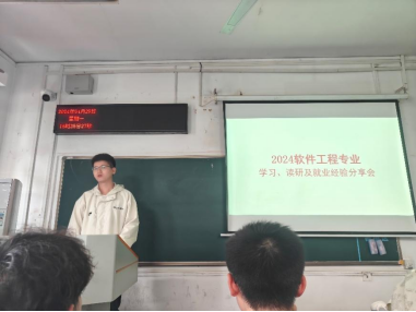 此次交流会邀请胡楠、朱佳睿、张灵冉和朱萌等优秀学生。他们根据各自对专业特点的理解,结合自身的经验,给学弟学妹们分享宝贵建议,并寄予殷切希望。已保送北京航空航天大学的胡楠分学年总结了学习重点、学习目标和学习方法,还分享了自己的实习经历和申请研究生offer的经验。带领与会者沉浸式感受自己的成长;保送北京大学的朱佳睿从自己的心态成长角度给出建议:坚定自我发展的信心,减少外界评价带来的焦虑、彷徨;保送电子科技大学的张灵冉以女生视角讲述了软工人的成长路径,她勉励同学们踏实学习,终能落实目标;即将入职阿里巴巴的朱萌做了“如何通过课程实习提升软件能力”的报告,他建议大家认真完成每一次课程实习,争取在功能上做到精致、性能上做到极致、架构上做到灵活、体系上做到全面。与会同学认真倾听,频频点头表示赞同,也引发了自身学业规划的深入思考。