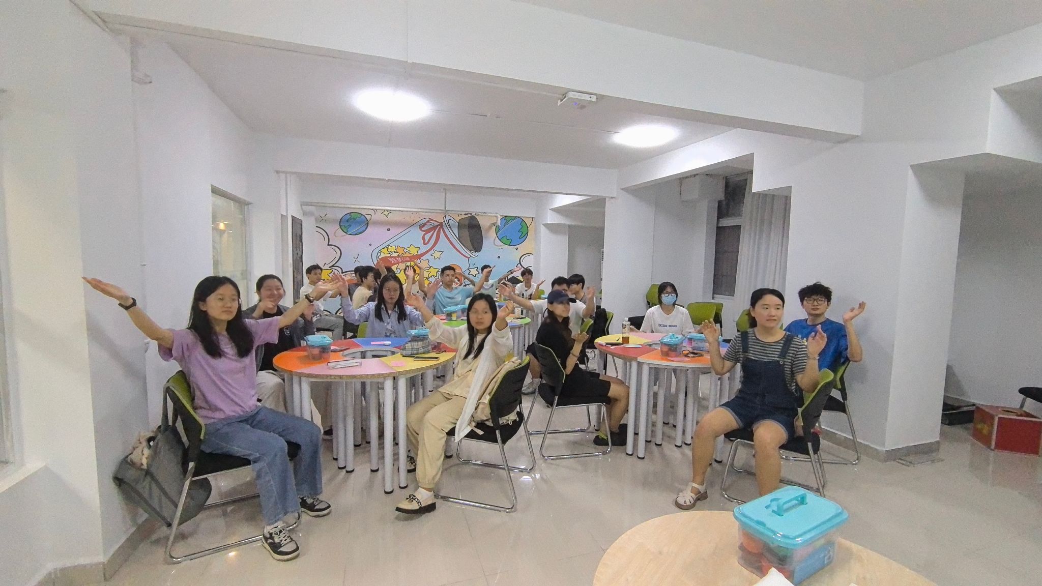 在闫维蓉的带领下,同学们伴随着《上春山》轻快的音乐,积极地舞动双手、活跃气氛、放松身心。热身操帮助同学们消除了拘谨情绪,拉近了彼此之间的心理距离,为接下来的活动作准备。