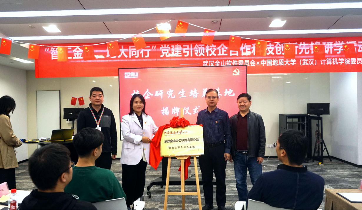 活动最后,举行中国地质大学十大买球官方网站金山办公研究生联合培养基地揭牌仪式,标志着双方在人才培养和党建交流方面的合作迈上了新台阶。武汉金山办公招聘总监陈志增在发言中回顾了金山发展历程的曲折与艰难,从二十世纪80年代金山创建,经历了几代金山人才走到今天。金山没有放弃科技报国的梦想,坚持扛起了民族软件的大旗,让中国有了自己的自主可控、信息安全的办公软件。希望未来能够进一步加深合作,在未来有更多的地大学子加入到金山集团。