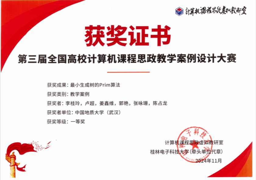在学院党委的大力支持下,多位教师携其精心设计的教学案例参赛。其中,邱芹军等老师提交的“地质知识图谱的构建及推理应用”、李桂玲等老师提交的“最小生成树的Prim算法”获得一等奖,徐永洋等老师提交的“BP神经网络模型原理与实现”获得二等奖。以上荣誉的获得不仅展示了我校计算机科学与技术领域的教学水平,更体现了我校在人工智能赋能思政教育融入课程教学方面的显著成效。