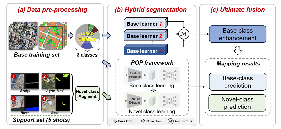 在2024年IEEE计算机视觉与模式识别会议(IEEE CVPR)举办的小样本土地覆盖制图挑战赛中,张洪艳教授带领团队夺得冠军。参赛队伍提出了一个广义的基于少镜头分割的框架,以更新高分辨率土地覆盖制图中的新类。提出的方法主要分为三个部分:(a)数据预处理:对基础训练集和新类的少镜头支持集进行分析和扩充;(b)混合分割结构:将多基学习器和改进的投影到正交原型(POP)网络相结合,增强基类识别能力,并从不足的标签数据中挖掘新类;(c)终极融合:基础学习器和POP网络的语义分割结果得到了合理的融合。该解决方案在多个评估指标上均取得领先,在小样本土地覆盖制图挑战赛中夺得冠军。