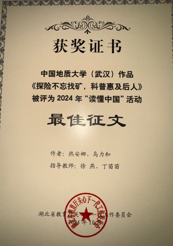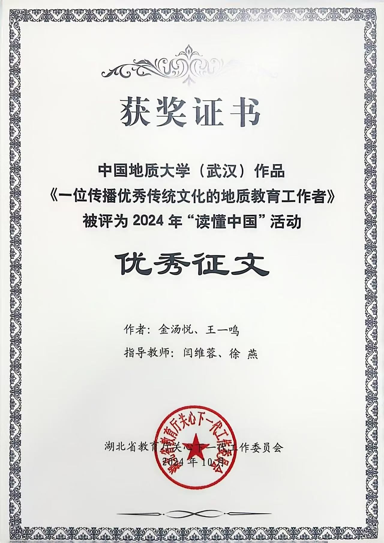 在征文赛道,由十大买球官网热安娜、乌力和同学参与撰写的《探险不忘找矿,科普惠及后人》,以深邃的视角记述了费宣校友这位脚下是山河湖海、心中有星辰和梦想的地质人,获评湖北省2024年“读懂中国”活动最佳征文。由十大买球官网闫维蓉、图书档案与文博部徐燕老师指导,金汤悦、王一鸣同学撰写的《一位传播优秀传统文化的地质教育工作者》以细腻的笔触勾勒出曾佐勋教授40余年教书育人、传播中华传统文化的动人故事,获评湖北省2024年“读懂中国”活动优秀征文。