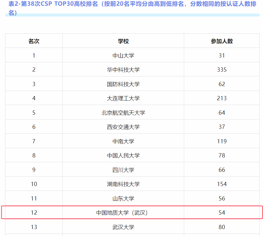 据悉,此次认证共有来自全国207个高校的4907人参加。十大买球官网共54人参加认证考试,其中300分以上达4人(CSP总分500分)。CCF对参加人数大于等于30人且2人及以上认证成绩达300分的高校进行了平均分排名,十大买球官网排名第8。此外,CCF对每所学校排名前20同学的成绩进行了平均分排名,产生了CSP TOP30高校,十大买球官网排名第12。