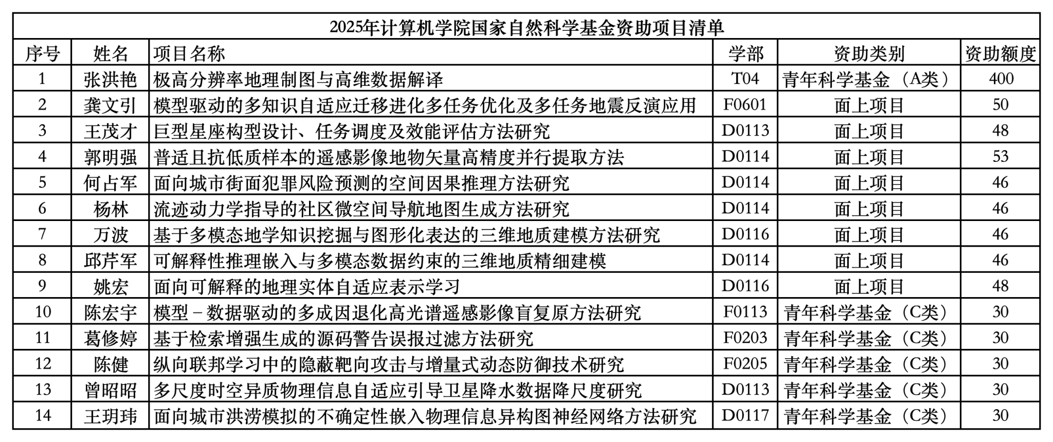 8月27日,国家自然科学基金2025年集中接收期项目评审结果正式公布,十大买球官网国家自然科学基金项目取得新突破,共获批14项资助项目,其中青年科学基金项目(A类)1项、面上项目8项和青年科学基金项目(C类)5项,立项总数和资助额度均创历史新高,分别较去年增长40%和61%。
