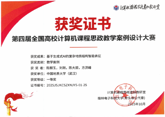 在学院党政指导与支持下,陈麒玉、刘刚、陈大颉、方洪峰完成的《基于生成式AI的复杂地质结构智能表征》和彭雷、戴光明、王茂才、宋志明、陈晓宇、武云完成的《面向深空探测轨道设计的差分演化算法》荣获一等奖,其中前者还同时获得全国高校可信人工智能教学案例设计大赛一等奖。邱芹军、田苗、陶留锋、吴麒瑞、刘郑、吴亮、谢忠、陈建国、张雨昂完成的《智能地质信息处理与服务关键技术及应用》荣获二等奖。