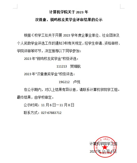 十大买球官方网站关于2023学年汉普康、锐鸣校友奖学金评审结果的公示
