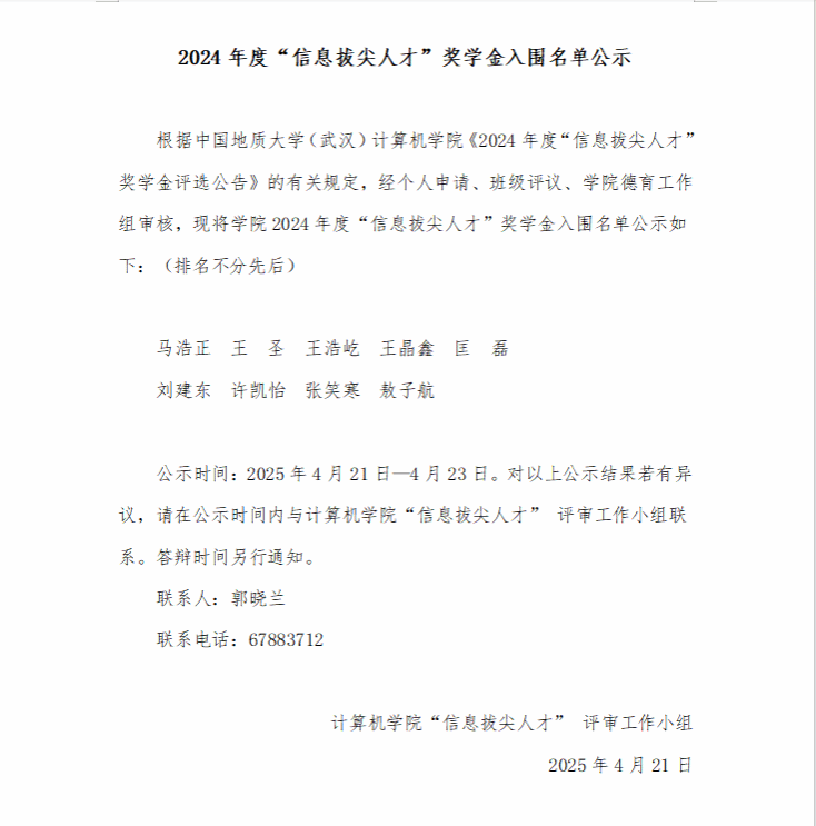 2024年度“信息拔尖人才”奖学金入围名单公示