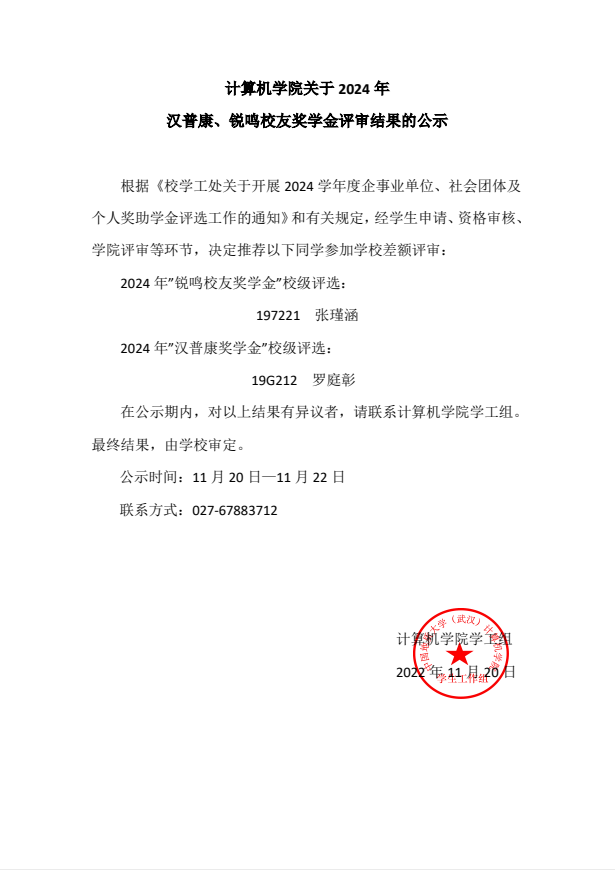 十大买球官方网站关于2024年汉普康、锐鸣校友奖学金评审结果的公示