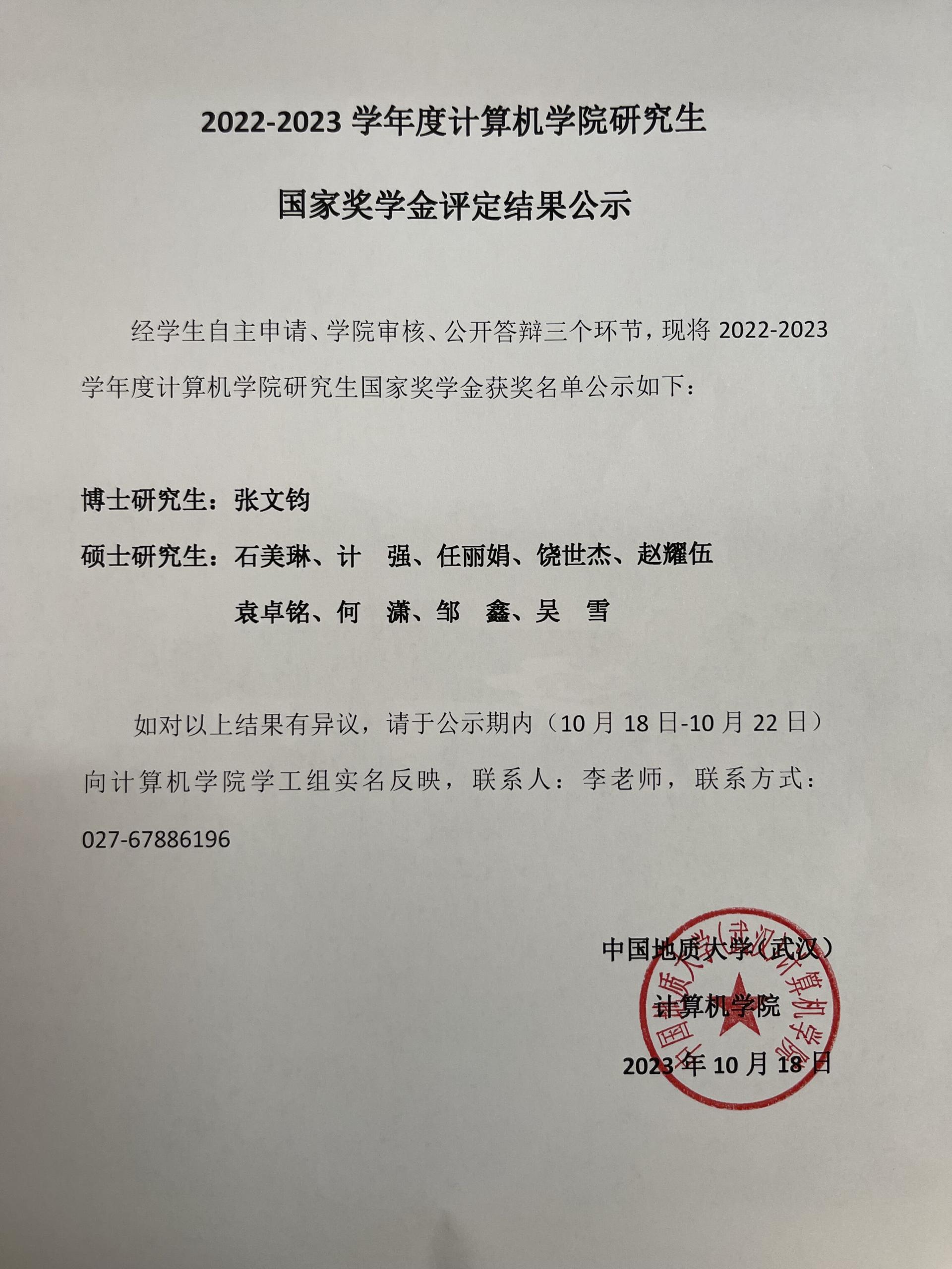 2022-2023学年度十大买球官方网站研究生国家奖学金结果公示