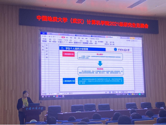 研究生秘书梁媛向同学们介绍研究生培养相关要求,解释了学籍注册、教学任务等近期研究生新生应注意的问题。