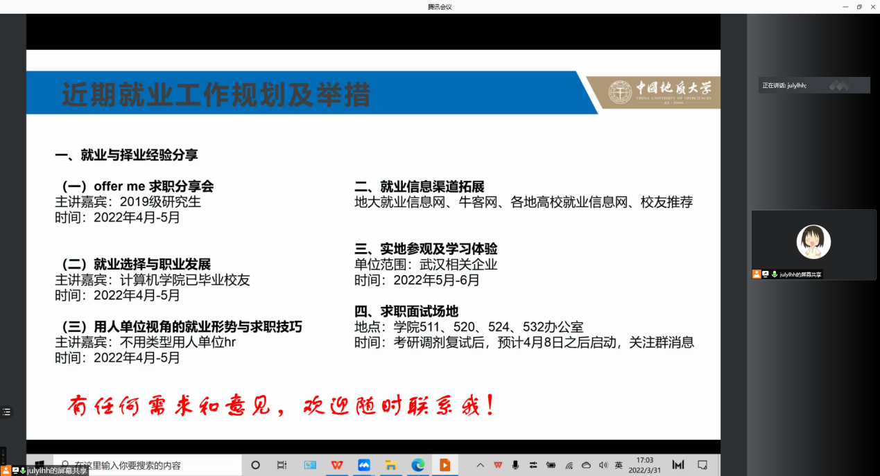 (通讯员:易章翱、马瑞华)为做好疫情防控教育引导和日常安全教育管理,促进研究生成长发展,十大买球官方网站研究生大会于3月31日成功召开。学院党委副书记傅苑、研究生秘书梁媛、研究生辅导员李欢欢和全体研究生参会,李欢欢担任主持。