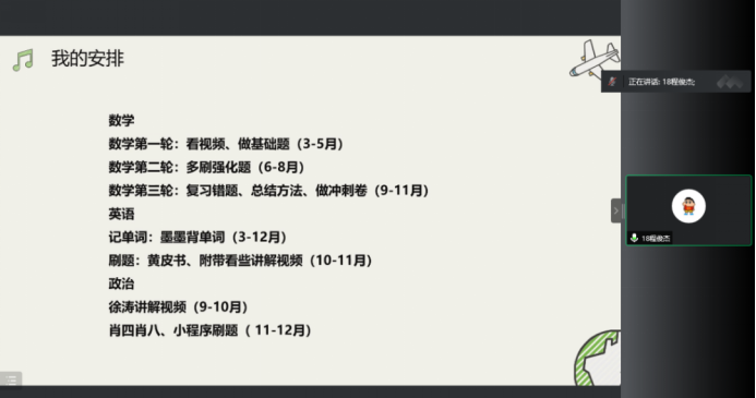 程俊杰从选择的角度出发,分享了自己在选择时的心路历程,介绍了考研流程与自己的考研历程安排。他在分享中介绍了地大开放日的要求、时间、材料与复习准备等事项。他指出,地大开放日对于绝大部分同学来说都是一个很好的机会,建议学弟学妹们在条件允许的条件下都进行参与。他最后建议同学们在考研过程中要不要轻言放弃,注意身体、适当锻炼、劳逸结合。