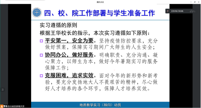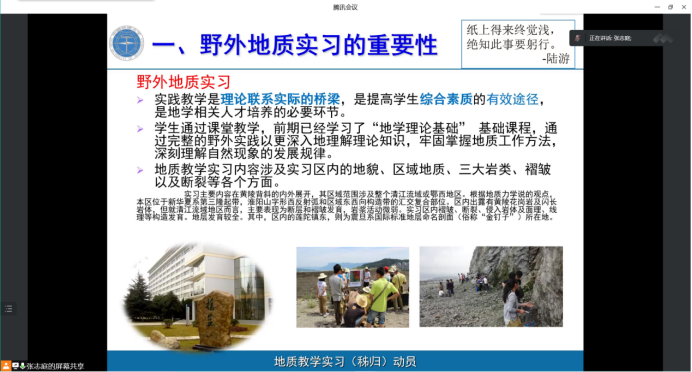张志庭老师重点介绍野外地质实习的重要性、实习内容、总体安排和校、院工作部署与前期准备工作,并对秭归实习站具体情况、教育管理要求、理论知识学习要求等内容作详细介绍,着重强调野外地质实习的注意事项,同时提醒参与实习的学生一切行动听指挥,严格遵守实习纪律。