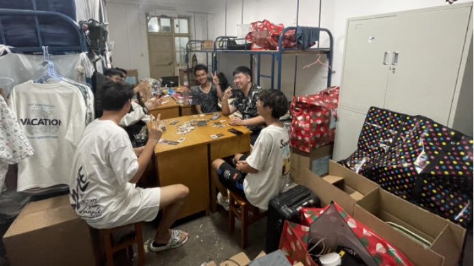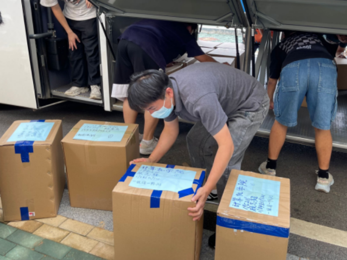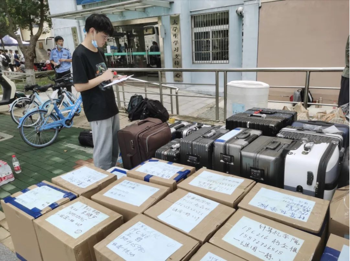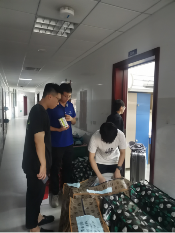 搬迁前一晚,同学们使用学院派发的物资,认真打包好行李,在各自的行李上贴好标签,以免丢失。学院还提前准备了消暑药品、晕车药、饮用水供学生自取。