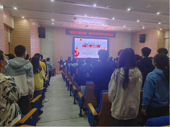 在团日活动开始之前,全体起立奏唱中国共青团团歌,随后主持人郭洋利宣布本次团日活动正式开始。郭洋利紧扣中国共产党精神之源,并以“中国共产党第二十次全国代表大会”部分场景切入本次团会主题:弘扬伟大建党精神,阐述过去五年的工作和新时代十年的伟大变革。