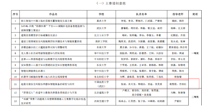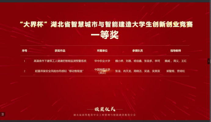 据悉全国智慧城市与智能建造大学生创新创业竞赛是当前工程管理领域影响力最大、影响范围最广的学科竞赛。本次比赛,十大买球官方网站2021级本科生吴昊宸与经济管理学院工程管理专业组成联队(团队成员:张淦、肖天龙、周晓洁、吴迪、吴昊宸),以参赛作品“起重吊装安全风险协同感知智能装备的研发与应用”(指导老师:郭聖煜、宫培松)进入决赛,最终从大赛主赛道来自98所高校的107支队伍的参赛作品中脱颖而出,荣获一等奖。此前在“大界杯”湖北省智慧城市与智能建造大学生创新创业竞赛中,该参赛作品已经获得一等奖。