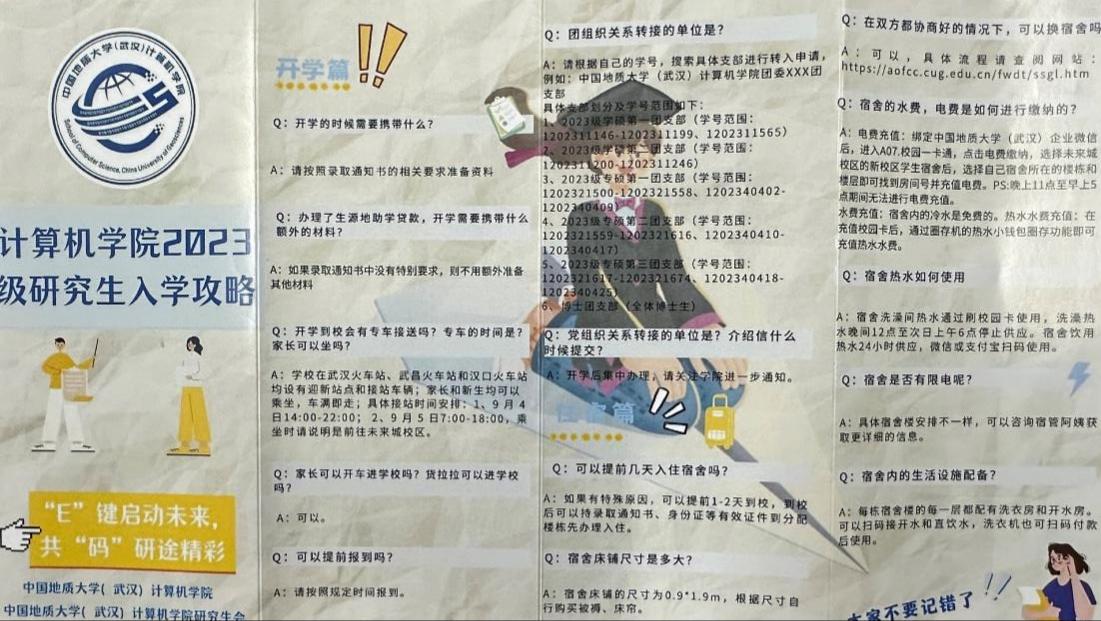 “E”键启动未来,共“码”研途精彩。为了帮助新生报到畅通无忧,学院精心制作了“十大买球官方网站2023级研究生入学攻略”,攻略分为开学篇、学习篇、生活篇三部分,帮助同学们全方位了解开学时需携带的相关材料、课程培养、团组织关系转接等事项,同时一一解答关于体育馆预约、宿舍水费电费缴纳、热水使用、宿舍管理等问题,帮助新生尽快熟悉校园环境。