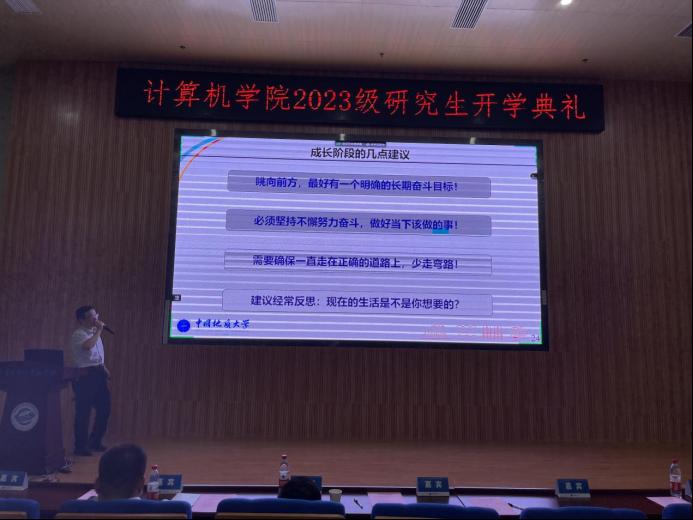 张院长首先肯定了同学们为考研付出的努力,对2023级研究生的到来表示热烈的欢迎。他以学校发展历史与人才培养成绩为切入点,向同学们展示了学校丰厚的底蕴,并从专业设置、师资队伍、科研平台与科研项目等方面介绍了学院近年来发展的概况。他谈到,国家在高新领域的巨大投入以及良好的政策指引,学校深厚的学术科研底蕴和一代代地大人的砥砺奋斗,为今天的在座的同学们奠定了良好的成长环境和优渥的发展平台,希望同学们秉承“艰苦朴素,求真务实”的校训精神,在地大十大买球官方网站刻苦钻研,实现出属于自己的新突破,为国家前沿科技发展贡献自己的力量!