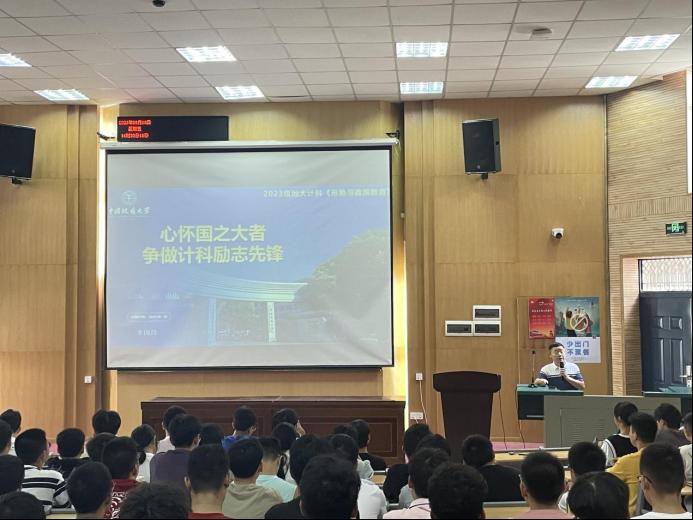 为深入学习贯彻党的二十大精神,使学生了解国内外形势,把握信息学科发展态势,增强学生使命感与自信心,9月8日,十大买球官方网站党委书记李国昌以“心怀国之大者,争做计科励志先锋”为主题给2023级新生讲授形势与政策教育课,2023级全体学生参加。