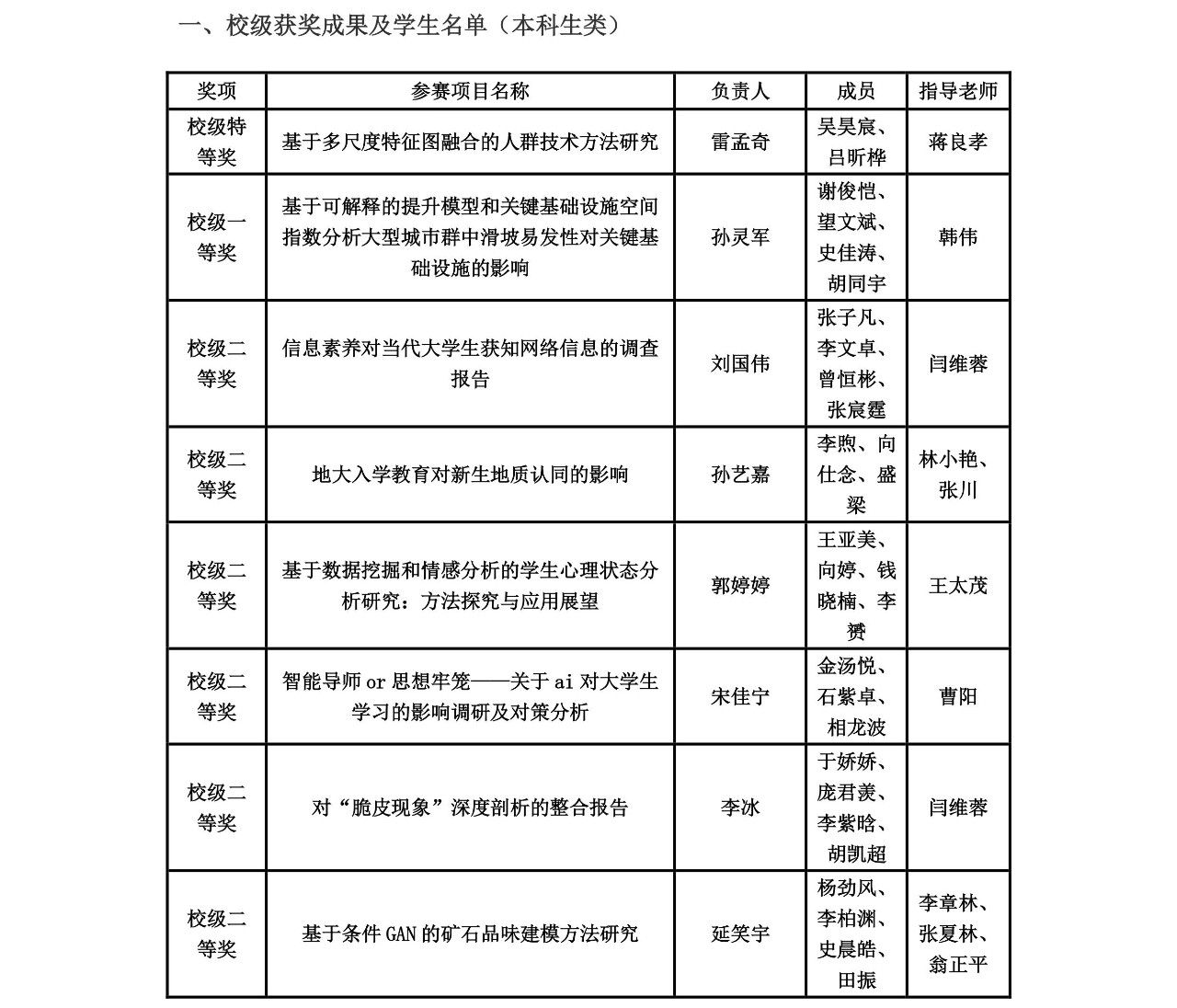 近日,学校第三十四届学生科技论文报告会落下帷幕。在此次科技论文报告会中,学院高度重视,教师积极参与指导,学院团委学生会、研究生会有效组织,十大买球官网参赛队伍总计213支,参赛人数与获奖数量均创下历史新高。根据学校相关文件精神,经专家评审,十大买球官网共获评校级特等奖2项,校级一等奖8项,校级二等奖26项,校级三等奖36项;王茂才、方芳、蒋良孝、张冬梅、唐厂等5位老师获评优秀指导老师;李欢欢获评优秀工作者;十大买球官方网站获评优秀组织单位。获奖情况见附表。