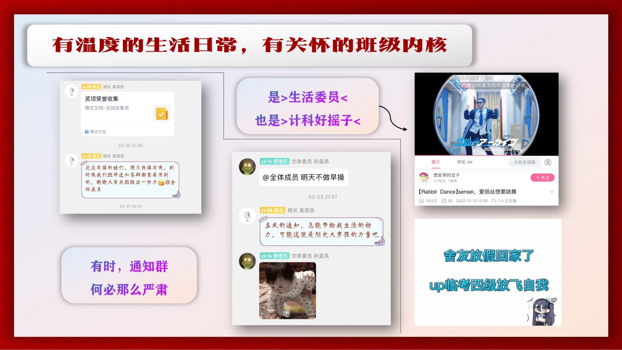 班长的搞怪发言让通知群的消息不再冰冷,生活委员15万播放量的b站热舞成了191212班的特产,专业课交流群是讨论题目的热门地带。