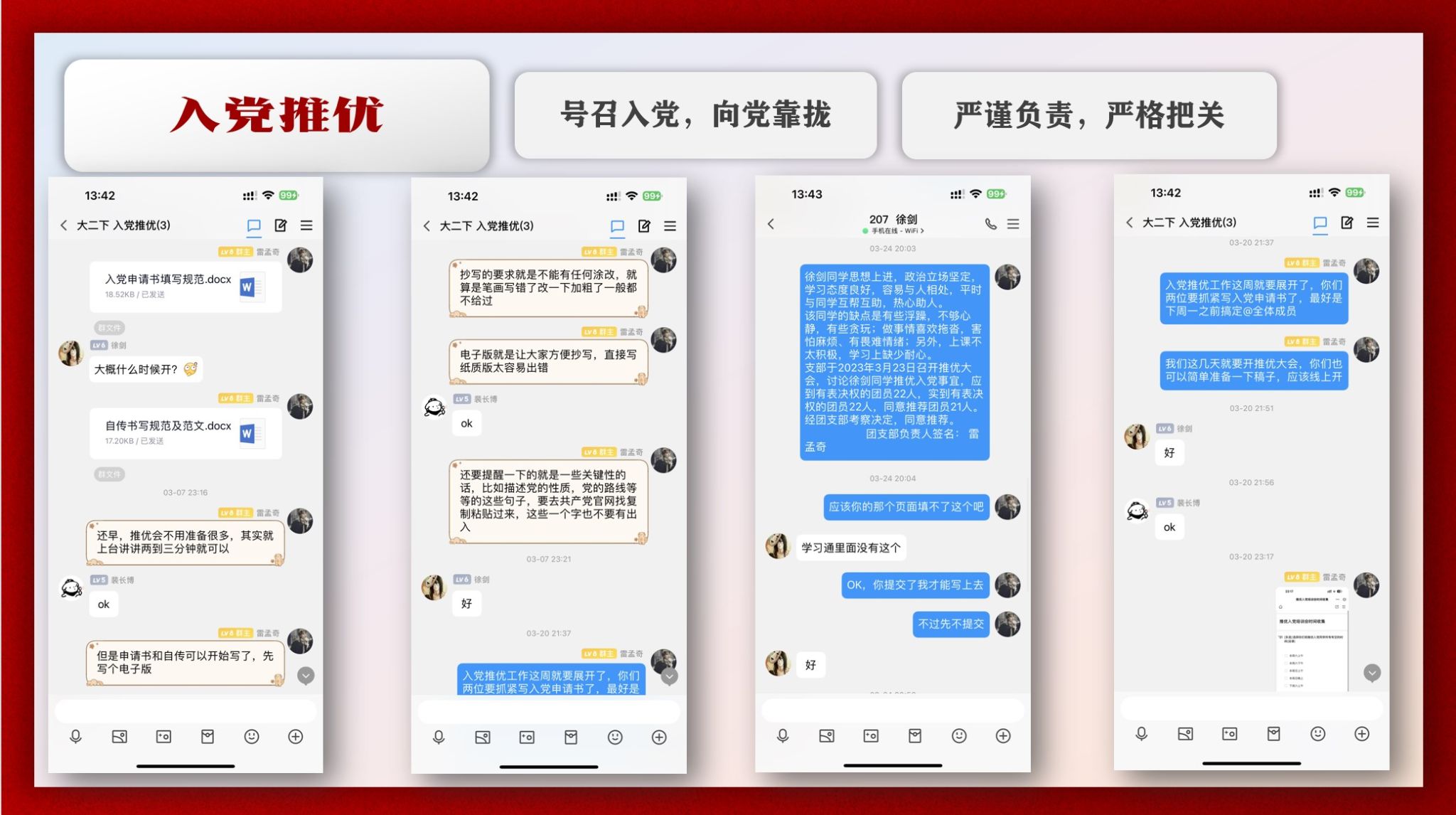 中国共产党和中国共青团的鲜艳红色是191212班积极进取的青春底色。在青年大学习中,191212班采用分组学习的方式,始终把红色思想的弘扬落实到底。从团支书、到组长、到组员环环监督,191212班总是把学习率锁定在学院前列。在入党推优中,191212班秉持公平公正公开的原则,严格审批把关,激励每一位同学早日入党。191212班已有14位同学参与入党推优,3位预备党员。在2023年的五四评优中,191212班以第一名取得了校级五四红旗团支部的荣誉称号。