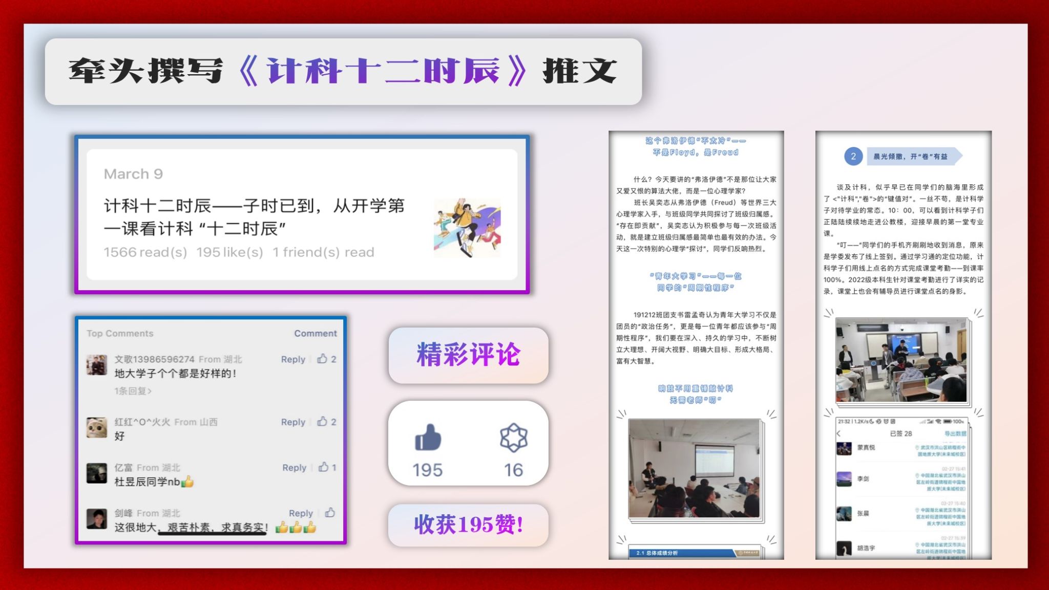 无论是科研还是调研,文体比赛还是社会实践,191212班全面绽放。根据班委的不完全统计,截至目前,累计已有国家级奖项15项、省级奖项8项、校级奖项34项、院级奖项15项,总计72项。191212班还牵头撰写了“计科十二时辰”公众号系列推文第一篇,收到了广泛的好评,现已有1566浏览量和195点赞量。