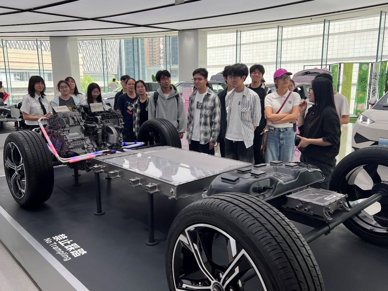 比亚迪不仅是全球新能源汽车的领军企业,更在电池、新能源、轨道交通、电子代工等多个领域布局深远。讲解员向同学们介绍了比亚迪的刀片电池技术、云轨交通系统,以及其在全球市场的产业影响力,让同学们对比亚迪的全产业链布局有了更全面的认知。