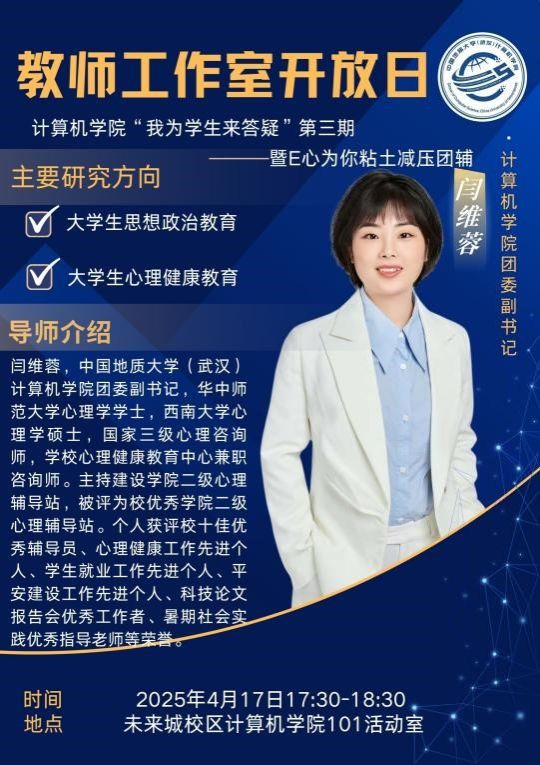 2025年4月17日下午,十大买球官方网站“计科师生办实事,我为学生来答疑”教师工作室开放日活动在未来城校区十大买球官方网站101活动室顺利开展。本期活动以“正念艺术减压”为主题,特邀十大买球官方网站团委副书记闫维蓉老师担任主讲嘉宾,党建辅导员谭文博老师及学生代表共同参与。活动通过“理论讲解+沉浸体验+艺术创作”的多元形式,为同学们打造了一场别开生面的心灵SPA。
