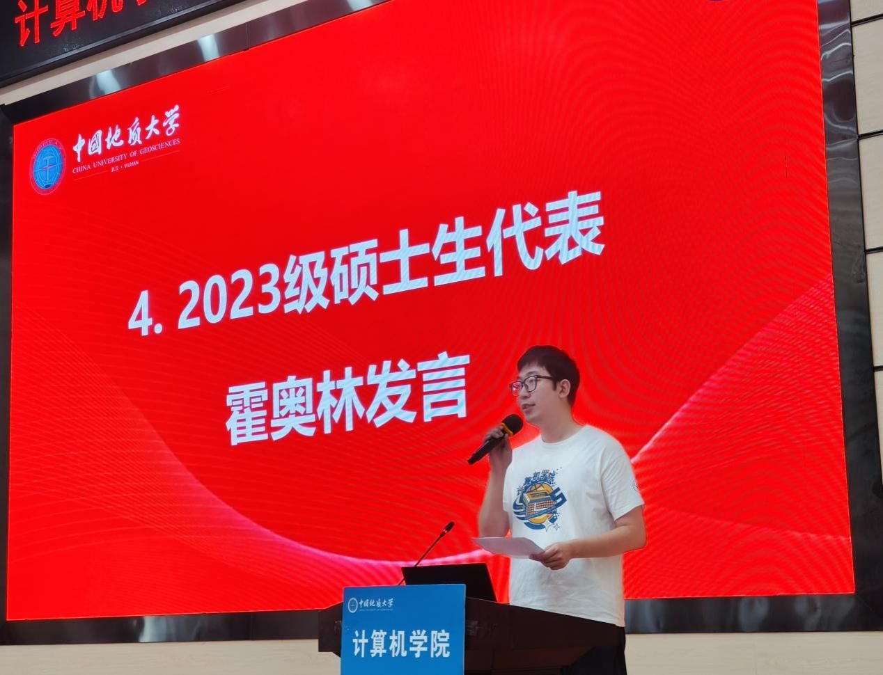 高年级学生代表、2023级硕士生霍奥林发言。他结合在校六年的学习成长经历,作了关于“不忘初心、勇于尝试、审视未来、劳逸结合”等方面的分享,鼓励新生坚定信念、把握机遇、勤于思考、全面发展,在充满活力与底蕴的十大买球官方网站勇敢追梦、踏实圆梦,以实际行动书写属于自己的地大计科故事。
