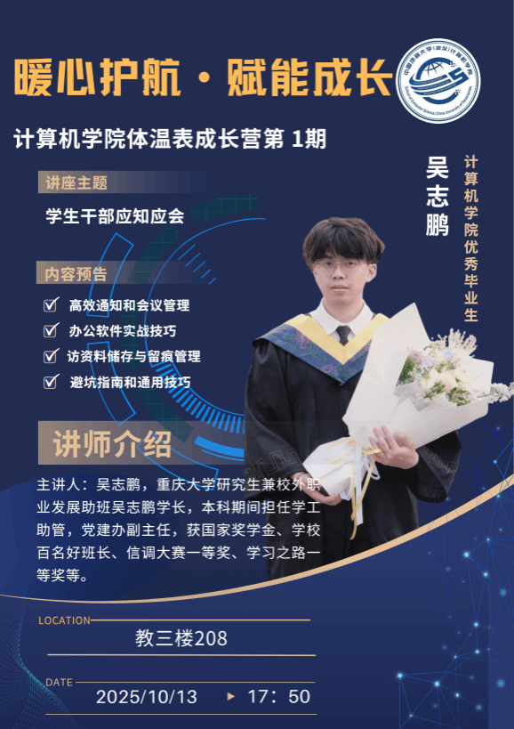 金秋十月,天高气爽。2025级计科学子满怀憧憬,正式开启了在大学校园的知识探索与成长之旅。为更好地陪伴和支撑新生们迈好大学第一步,学院筹划成立了2025级学生服务组并启动“体温表成长营”计划。一系列丰富多彩的学业支持与成长发展活动陆续展开,为本科新生的大学旅程提供了全方位的保障与支持。