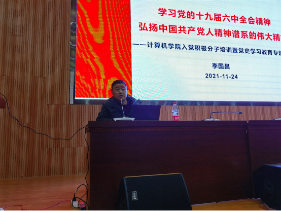 (通讯员:杨书睿)为学习贯彻党的十九届六中全会和习近平总书记七一重要讲话精神,深入推动党史学习教育,11月24日中午,学院党委书记李国昌为十大买球官方网站第29期入党积极分子主讲《学习党的十九届六中全会精神,弘扬中国共产党人精神谱系的伟大精神》专题党课。