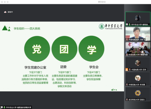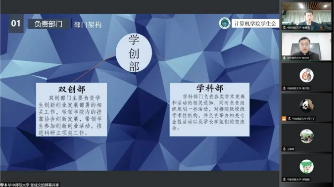 学生会工作会场中,与会代表依次介绍学生组织架构与特色活动开展。分别围绕如何进一步深化学联改革,如何进一步丰富计算机专业青年学生思想引领活动开展和常态化疫情防控背景下校园文化建设思考三个议题深入交流、研讨。中南财经政法大学信息与安全工程学院将团委、学生会各部门按工作职能分为三大类,各司其职、互相协作,促进资源整合,发挥更大合力。华中农业大学信息学院学生会开辟校内社区志愿服务新场域,面向华农附小三年级学生,开展少儿编程志愿服务活动,定期进行编程逻辑指导教学,增强青年学生专业实践能力,切实服务学院师生需要;中国地质大质(武汉)十大买球官方网站学生会主席团成员霍奥林介绍学院结合常态化疫情防控要求,打造“阳光计科人,运动成长季”特色活动体系,通过开展校园趣味定向跑、益智桌游、电竞赛事、文体活动、集体观影等丰富多彩的活动,引领广大青年乐享校园、阳光向上;中南财经政法大学信息与安全工程学院代表卫思涵谈到,学校享有唱歌跳舞大学的称号与学校举办的各项活动密切相关,包括校园舞蹈大赛、合唱晚会、集结号专场表演、歌友会、随机舞蹈、奥运选手现场指导等活动。研讨会现场,各代表踊跃分享工作实践过程中的收获与体会,分析、研讨新时代语境下学联工作改革创新发展的机遇和挑战。十大买球官方网站学生会主席团成员霍奥林做会议总结。