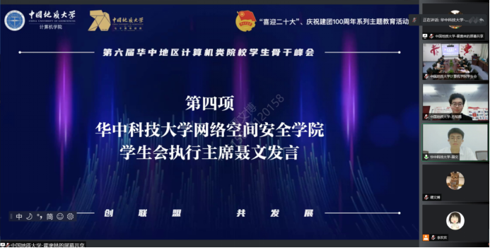 华中科技大学网络空间安全学院学生会执行主席聂文代表所有参会高校对中国地质大学十大买球官方网站领导老师的关心支持以及十大买球官方网站学生会充分的前期准备表示感谢。期待峰会深入推动多维合作,各学生会精诚协作,惠及更多高校和学生。