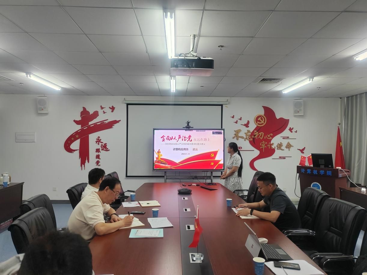 计算机应用系党支部书记武云以《全面从严治党永远在路上——深刻领会全面从严治党的基本要求和重大意义》为题,分享了全面从严治党的目的、历史沿革、基本内容及贯彻执行四个方面学习体会。