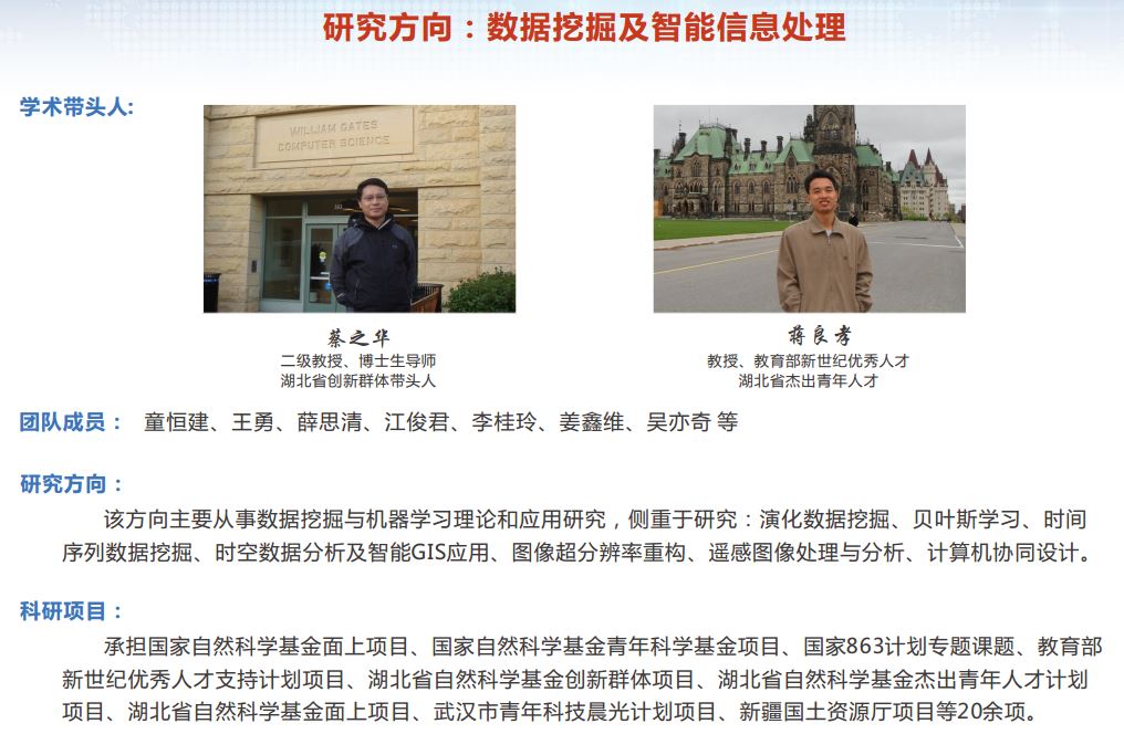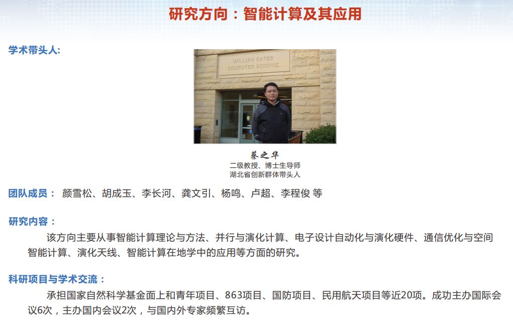 主要开展智能计算、数据挖掘与机器学习、数据库技术与服务计算、图形图像处理与多媒体技术等方向的科研工作,在智能优化与学习、遥感图像处理、航天器任务智能规划等方面形成了特色研究方向。共有专任教师26人,其中学术带头人2人,学术骨干4人;近5年共承担国家级科研项目18项,发表SCI论文56篇 ,出版专著2部,获得省部级奖励1项、国家发明专利2项。(数据截至2017年12月)