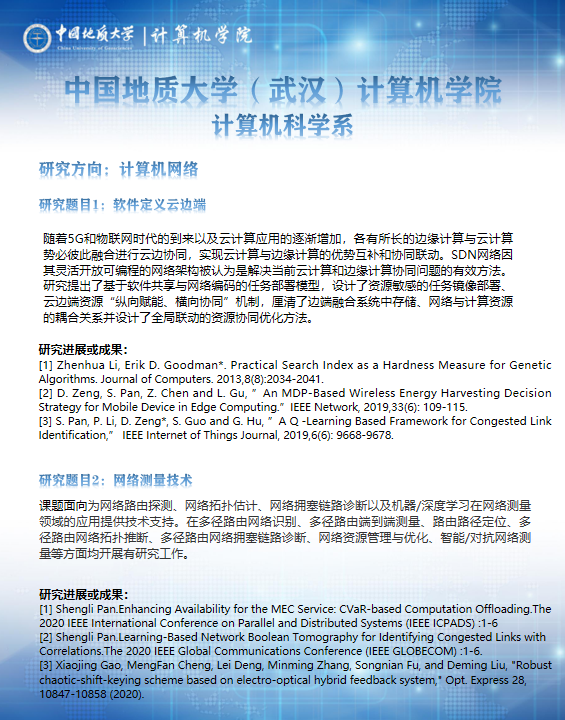 主要开展信息安全、大数据知识图谱、计算机网络技术、软件定义网络,物联网、云边计算、网络策略技术等方面的科研工作。提出了基于软件共享与网络编码的任务部署模型,设计了资源敏感的任务镜像部署、云边端资源“纵向赋能、横向协同”机制,厘清了边端融合系统中存储、网络与计算资源的耦合关系并设计了全局联动的资源协同优化方法。共有专任教师8人,其中学术带头人1人,学术骨干2人;主持或参与过国家自然科学基金项目,国家攻关项目,国土资源部重点攻关项目以及省部级项目多项。国内外专业期刊发表论文100余篇,获省级科技进步二等奖1次,获部级科技进步一等奖1次,国家发明专利和软件著作权20项。