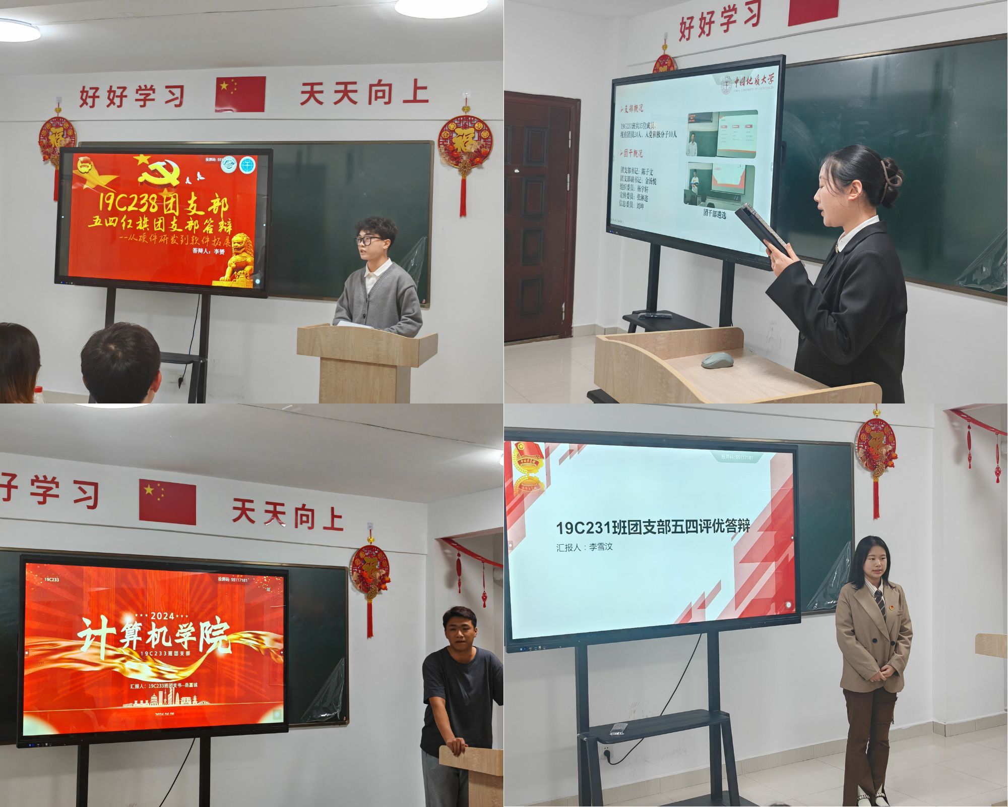 各支部结合专业特色与实际情况,从支部建设、支部活动、支部荣誉及未来展望等方面,充分展示了过去一年的工作成绩和支部风采,彰显了奋发向上、追求卓越的青春力量,呈现出一幅幅生动的团支部画卷。与此同时,现场的评委们也专心致志地对各团支部的答辩进行细心聆听并给予评议,针对各团支部的答辩情况进行提问与现场打分。