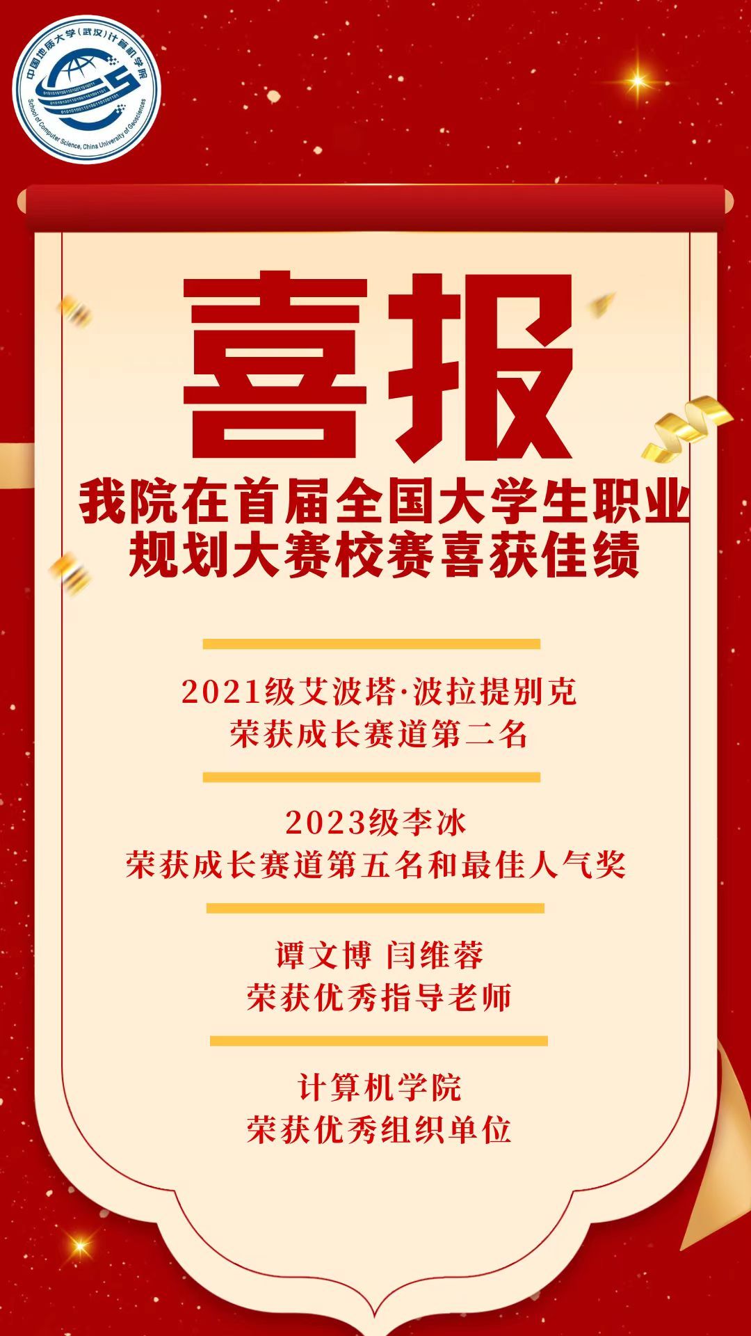 在激烈的校内决赛中,十大买球官网表现尤为出色:21级艾波塔·波拉提别克荣获成长赛道第二名,23级李冰荣获成长赛道第五名和最佳人气奖;21级辅导员谭文博,23级辅导员闫维蓉荣获优秀指导老师,十大买球官方网站荣获优秀组织单位。