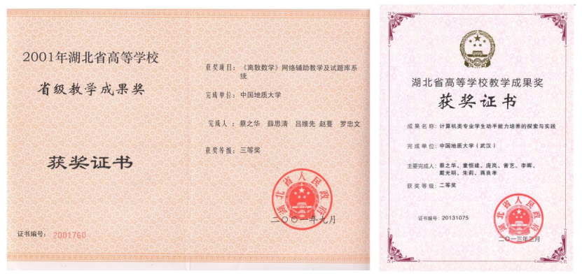 自1986年任教以来,蔡之华老师长期主讲本科生课程和研究生课程,包括数据结构、离散数学、机器学习、计算机应用数学,承担过本科生学务指导老师和班主任工作。他任班主任的班级曾荣获“湖北省优秀班集体”。他非常重视课堂教学,常对学生说:“高效的课堂学习是培养学科兴趣的动力。”蔡老师“组合数学”(学生们习惯称呼,实为“计算机应用数学”)经常板书推导公式,给学生留下了深刻印象。他带领教学团队,积极探索新教学模式,延展课堂教学空域和时域,优化教学交互过程,提升教学质量。他带领的教研团队多次获得湖北省、学校教学成果奖,主持的教研项目获湖北省人民政府二、三等奖各1项,公开发表教研论文5篇,编写教材3部,其中一部获得中国地质大学普通高校优秀教材一等奖。他是国家一流本科专业“计算机科学与技术”建设点的负责人。
