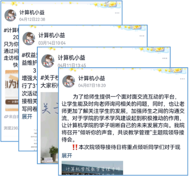 聆听同学诉求,沟通零距离。将学院权益服务平台“计算机计小益”,打造为全院学生诉求“收集站”,目前平台总关注人数达1384人,累计发送消息1307条,总浏览量达72831次。针对学院教育教学热点问题,开展院领导接待日,覆盖两校区,开展6次,研讨学风建设、教学建议。