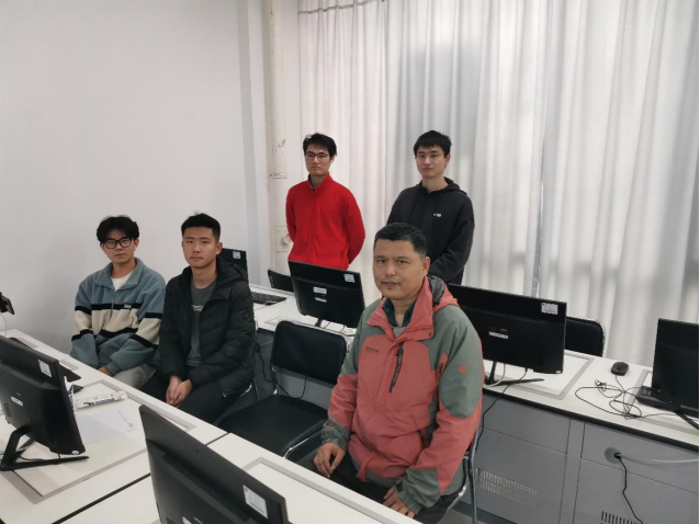 罗老师与同学们一起在机房讨论策略,前排左1叶礼鸣 左2刘志鑫 左3罗忠文,后排左1曾逸飞 左2黄鹏(志愿者)