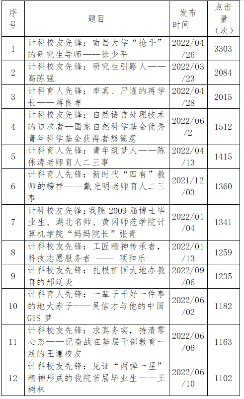 表一:学院官网部分“计科先锋”事迹点击量统计表