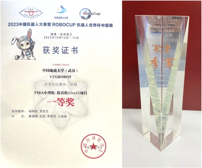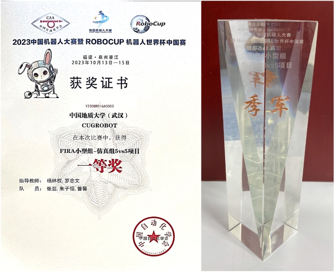 2023年中国机器人大赛暨RoboCup机器人世界杯中国赛(以下简称:中国机器人大赛)落下帷幕,十大买球官网CUGROBOT代表队参加。经过激烈角逐,杨林权、罗忠文两位老师带领研究生张翡、夏倩倩和本科生朱子恒、王哲、曾馨、李婉雪、王晶鑫获得FIRA仿真组5vs5项目季军、一等奖,FIRA仿真组11vs11项目季军、一等奖。比赛过程历历在目,记忆犹新。
