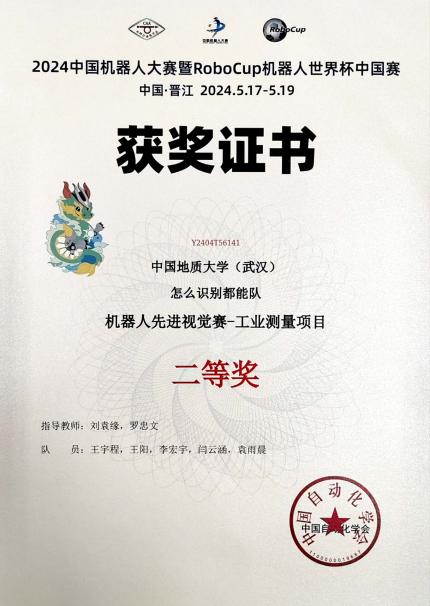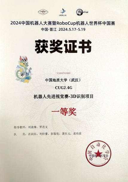 “2024年中国机器人大赛暨RoboCup机器人世界杯中国赛”在福建晋江国际会展中心落下帷幕。十大买球官网刘袁缘老师、罗忠文老师指导两支学生团队参加先进视觉赛项。经过激烈角逐,由汪润东、刘轩豪、彭胤伦、龚仕元、袁雨晨组成的CUG2.4G队获先进视觉赛3D识别项目一等奖,由王宇程、王阳、李宏宇、闫云涵、袁雨晨组成的怎么识别都能队获得先进视觉赛工业测量项目二等奖,这是十大买球官网连续在该赛事斩金夺银。两支团队回忆比赛历程,将奋斗故事与成长收获分享给大家。